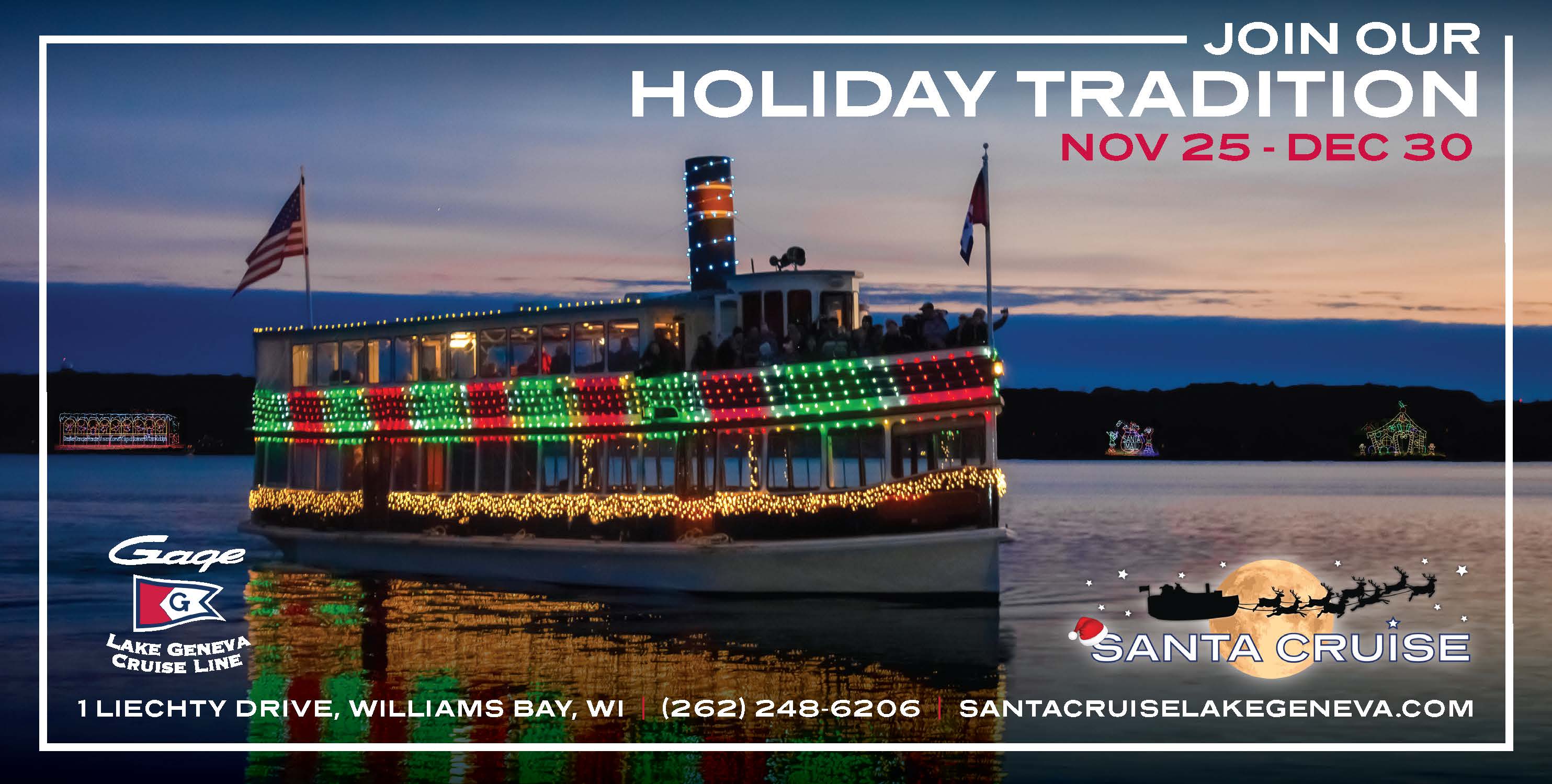 Santa Cruise Santa Cruise runs from the day after Thanksgiving until December 30. ... Lake Geneva Cruise Line. Winter Harbor Office: 1 Liechty Drive Williams Bay, WI 53191. 262-248-6206 reservations@glcl.net. Quicklinks. Schedule; Find Us; Parking; Dining; Lake Geneva Cruise Line; Buy Tickets. Sign-up for Our Email.